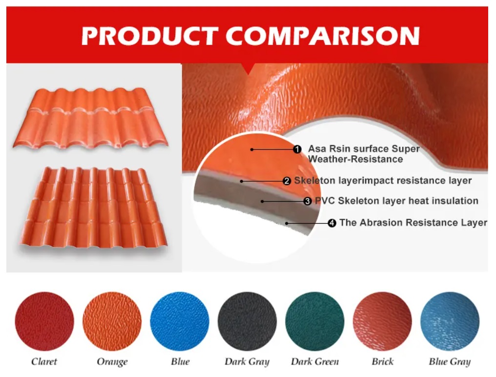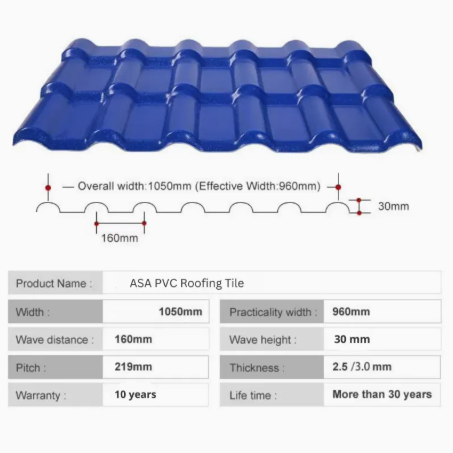 ASA synthetic resin tiles & PVC roof sheets integrate lightweight convenience, vivid color fastness, high strength, and superior toughness, ensuring long-lasting durability for diverse applications.Ideal for both decorative roofing accents and heavy-duty structural projects—from residential homes to industrial workshops—these sheets feature an exceptional strength-to-weight ratio thanks to their low density.